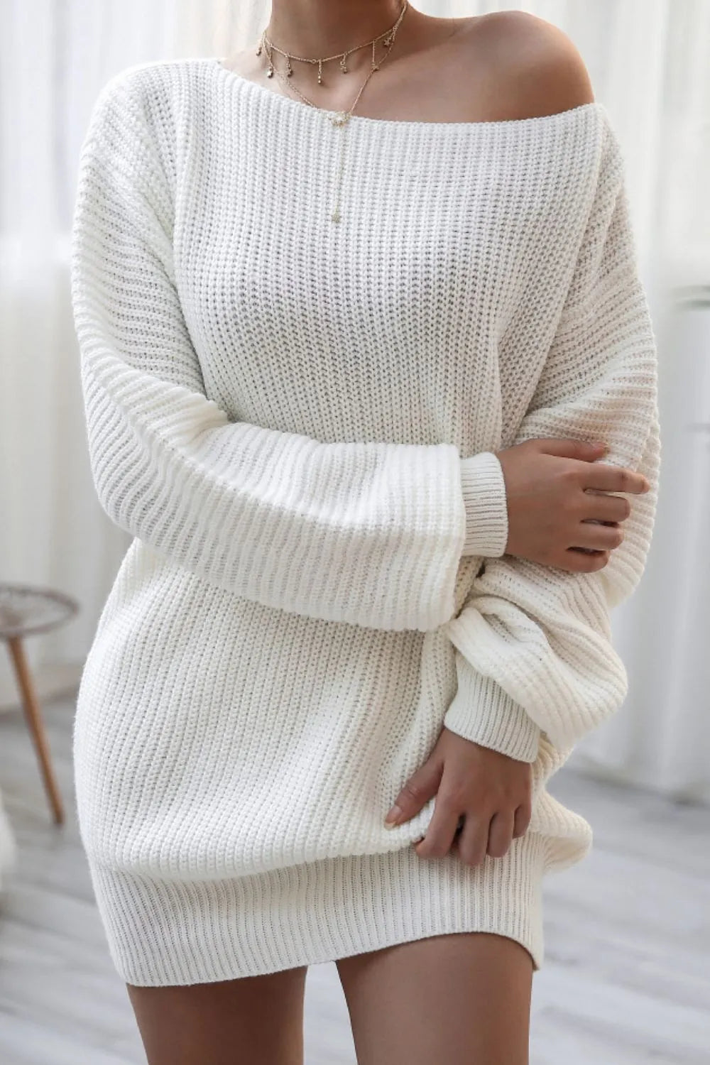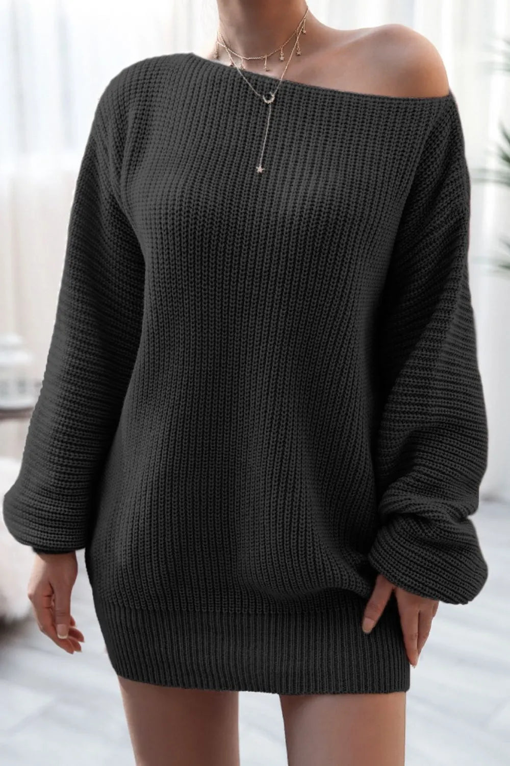 Boat Neck Long Sleeve Mini Sweater Dress
